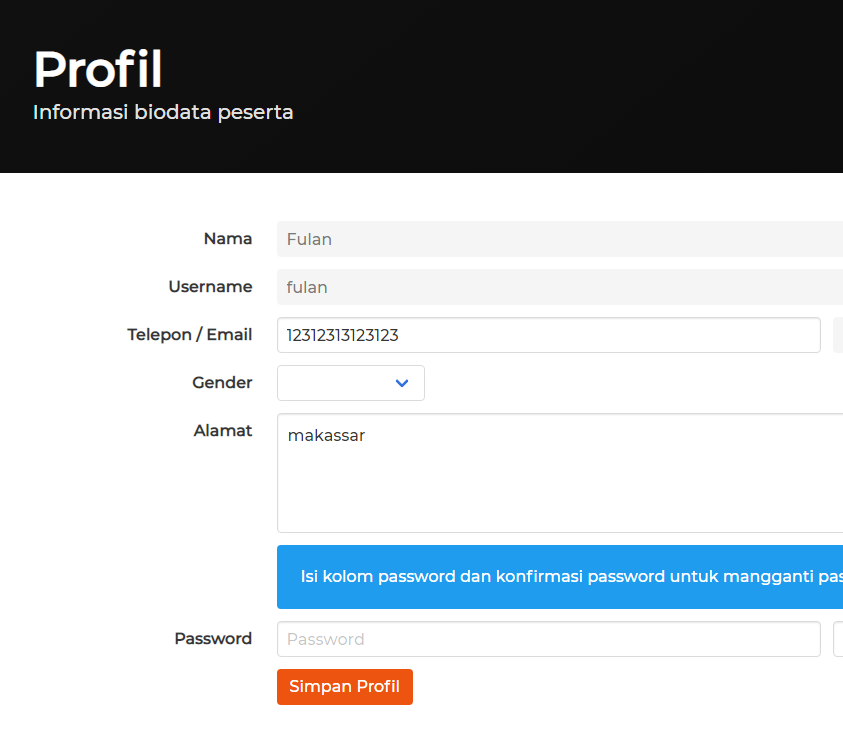 User dapat melakukan update untuk kolom isian nomor kontak, gender, alamat dan password. Klik Simpan Profil untuk menyimpan perubahan yang telah Anda input.